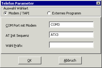 Einstellung Modem / TAPI:In "COM Port mit Modem" muss der COM serielle Port eingestellt werden. Unter Windows muss hier z.B. COM1 unter Linux tty01 eingetragen werden. Mit der AT Init Sequenz kann ein Modem Befehl abgesetzt werden, der vor dem Wählen das Modem initialisiert. Mit Wählpräfix kann der Verbindungsaufbau über eine Nebenstelle parametriert werden. Wenn man keine Nebenstellenanlage hat, so bleib das Feld leer, ansonsten kann hier 0W für 0 = Amt holen und W = Warten auf Freizeichen. Kleine Übersicht der Modem-Befehle für die Init-Sequenz: