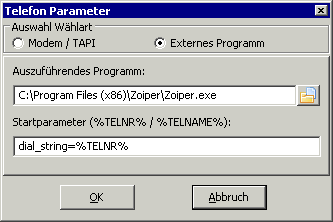 Doppelklick auf den Text "Startparameter" fügt den Text "%TELNR%" in das Eingabefeld ein. Hinweis:Telefonverbindungen sind kostenpflichtig, bei Wählen mittels EleLa entstehen Telefonkosten der jeweiligen Telefongesellschaft/Dienstanbieter. Vergewisserns Sie sich, dass das Modem/die Telefonverbindung nach dem Telefonieren auch wirklich wieder getrennt wurde. EleLa selbst kostet keine zusätzliche Gebühr. |