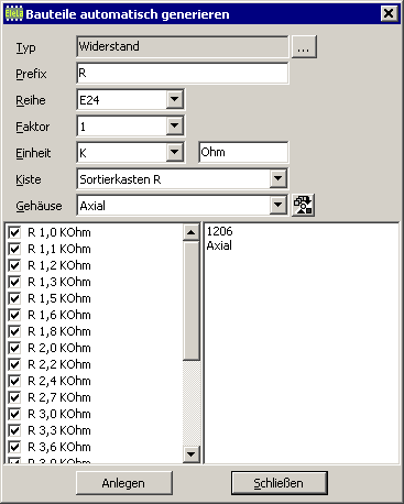 Bauteile automatisch anlegenMit dieser Funktion können viele Bauteile mit wenigen Tasten-Klicks automatisch angelegt werden. Ausgewählt wird der Typ, die Bezeichnung und optional können zu jedem Bauteil die Gehäuse-Varianten erstellt werden. Diese Funktion wird aus "Bauteile-F2" >> Taste Import/Export >> Menüpunkt "Bauteile generieren" aufgerufen. Als erstes muss der Typ ausgewählt werden. Mit Prefix werden alle Buchstaben für den Start eingegeben. Die Reihe definiert die E-Reihen E3, E6, E12, E24, E48, E96, E192 und auch 0..9 oder 0..99. Mit dem Faktor kann der Wert der Reihe *1 oder *10 oder *100 gerechnet werden. Die Einheit kann von p (Piko) ... G (Giga) oder nichts ausgewählt werden. Neben der Einheit ist ein freies Text-Feld in der Zusätze eingegeben werden können. Mit Kiste kann festegelgt werden ob gleich ein "Kiste/Lager" Eintrag mit erzeugt wird. Die Fachposition muss nachträglich ausgefüllt werden. Damit erspart man sich zumindest das Anlegen eines neuen Datensatzes sowie die Auswahl der Kiste. Alle gewählte Gehäuse erhalten dann diesen Kiste Eintrag. Mit Gehäuse wird eines