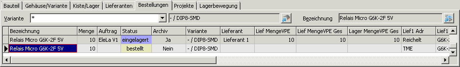 Bauteile verwalten - BestellungenHier sind alle Bestellungen, auch Archivierte zu dem Bauteil ersichtlich. Änderungen können nicht vorgenommen werden, diese Ansicht dient nur zu Übersicht. Im Auswahlfeld kann anhand "Gehäuse/Variante" gefiltert werden. Mit der ">>" Taste kann zum "Gehäuse/Variante" Eintrag gesprungen werden. Mit der ">>" Taste bei Bezeichnung oder Doppelklick in der Tabelle kann zur Bestell-Ansicht gewechselt werden, dabei wird automatisch die Archiv-Ansicht gezeigt wenn es eine Archiv-Position ist. Die Liste kann mit der Tastenkombination "STRG+P" als HTML-Dokument ausgedruckt werden.