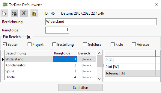 >> Eine Änderung dieser Daten hat keinen Einfluss auf die bestehenden Bauteil Datensätze. Mit "Bereich" kann festgelegt werden bei welchem Bereich von EleLa die TecData Vorlage verwendet wird. Es können mehrere Bereiche zugeordnet werden. In der unteren linken hälfte werden alle Defautlwerte deklariert.