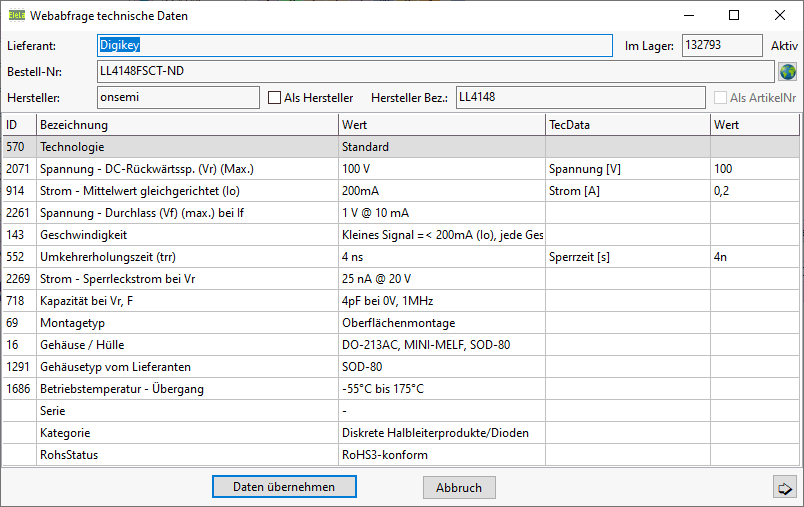 Bauteile - Technische Daten WebabfrageMit dieser Funktion können technische Daten von Digikey geladen werden. Die Vorraussetzung dazu ist ein DigiKey API Zugang sowie muss bei Lieferant eine Digikey Bestellnummer hinterlegt sein. Derzeit können die technische Daten nur von Digikey abgefragt werden. Diese Funktion wird aus "Bauteile-F2" >> "Gehäuse/Variante"