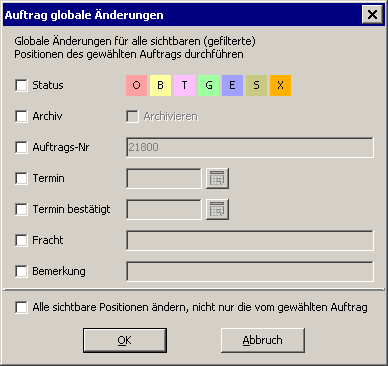 werden. Zusätzlich kann auch eine Zahl in das Feld "Kennz" oder "Prio" eingegeben werden. Globale Bearbeitung vom Status von mehreren BestellungenIn der