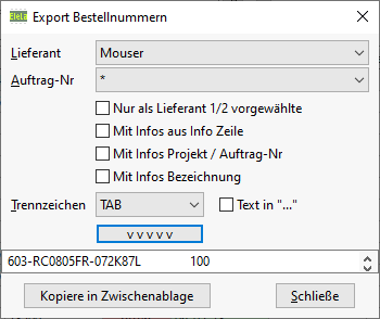 Um die zweite Variante durch zu führen muss das Häkchen "Alle sichtbare Positionen ändern" angewählt sein. Automatische vergabe der Auftrags-NrIn der Bauteile mit Min-Mengen Unterschreitung:Diese Bauteile können über einen Dialog eingefügt werden, siehe hier. Exportieren einer Bestellung: Für den Lieferant "Reichelt" kann die Bestellung exportiert