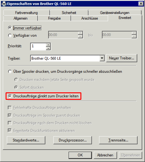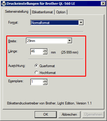 Drucken von Etiketten mit einem PTouch QL560LE DruckerTestausdruck mit EleLa: Die Konfiguration des Druckers unter Windows, Änderungen der Standard Einstellungen sind rot markiert (Systemsteuerung > Drucker > Eigenschaften des Druckers): Änderung der Einstellung unter Optionen der Druckerauswahl, nachdem die Drucken-Taste im Etikettendruck gedrückt wurde. Hier wird das Etikett eingestellt. Die Länge definiert die Breite des Papieres und die Ausrichtung