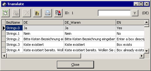 kann ein Dialog geöffnet werden der bei der Übersetzung hilft. Diese Übersetzungs-Tabelle wird in der Datenbank mit gespeichert, somit kann jederzeit der Text übersetzt werden, so wie man gerade Zeit hat. Diese "Translate"-Tabelle dient nur zur Übersetzungs-Hilfe. Um die Texte im Programm an zu schauen muss die Sprache exportiert und mit der Taste "Lade Texte" aus dem Hauptprogramm ("Extras" >> "Info") geladen werden. Im Schnellsuchen-Feld kann zu dem Datensatz gesprungen werden, der als Sortierspalte ausgewählt wurde. Wenn die "Y" Taste für Filter gedrückt wurde, so werden nur die Datensätze gezeigt, die mit der Sortierspalte übereinstimmen, dabei kann auch ein * als Wildcard verwendet werden. In der Tabelle sind Felder für die Sprachen DE, DE_Waren, EN, ES, FR, IT, NL, PL, RU vorbereitet, diese können für beliebige Sprachen genutzt werden. Übersetzung in EleLa dauerhaft hinterlegenIn der INI-Datei kann die Übersetzungs-Datei eingegeben werden. Dazu muss die INI Konfigurationsdatei geöffnet und folgende Parameter werden hier hinterlegt: