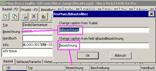 Direkte Übersetzung in EleLaWenn man einen Text eines TLabel oder TGroupBox oder TTabControl ändern möchte, so kann man dies direkt in EleLa mit SHIFT+ALT+Doppelklick auf dieses Steuerelement machen. Dabei öffnet sich ein Eingabedialog in dem man die Texte ändern kann. Wenn dem Label ein Steuerelement verknüpft ist, das wiederum eine Datenbank Verbindung hat, so kann darüber direkt das eine Datebank Feld mit geändert werden. Beispiel: