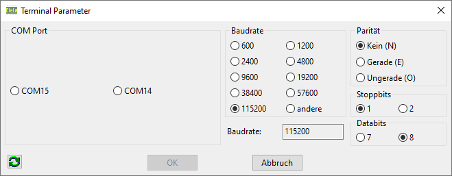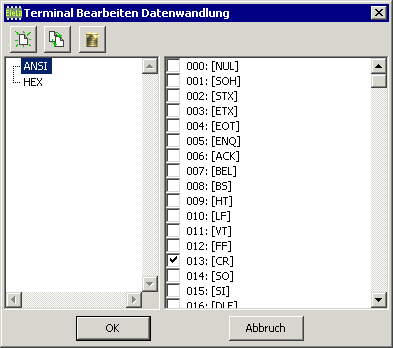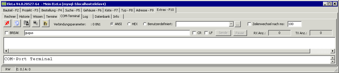 Extra TerminalMit dem Terminal kann man Daten einer seriellen Schnittstelle aufzeichnen und Daten senden. Die Darstellung der empfangenen Zeichen kann umgeschaltet und auch benutzerdefiniert eingestellt werden. In der oberen Zeile kann ausgewählt