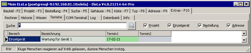 Service-Termine für Einzelgeräte mit angezeigt. Als "Termin2" werden die fälligen Wartungsintervalle (Termin - 7 Tage) gezeigt. Termine von Bestellung:Ist das Häkchen "Bestellung"