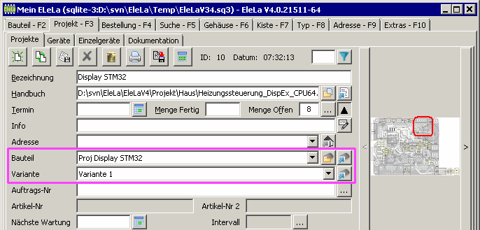Zuordnung. Die Verknüpfung erfolgt dann unter Projekt oder Gerät: Anhand dieser Verknüpfung weis EleLa schon dass dieses gefertigte Projekt dieses Bauteil wird und kann den Lagerbestand entsprechend erhöhen. |