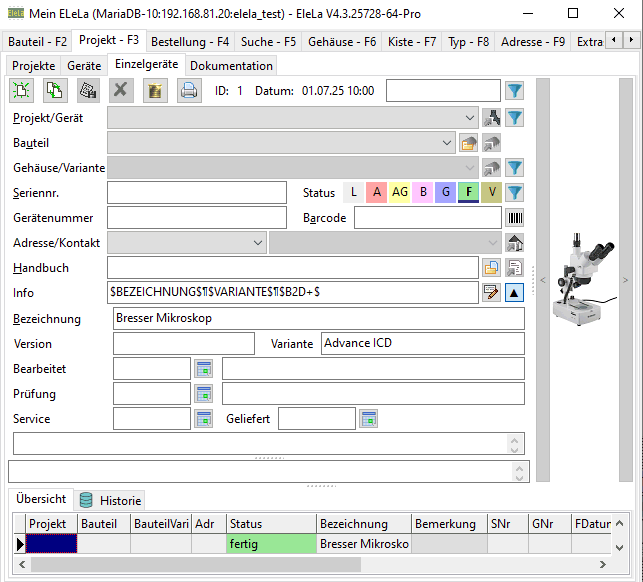 mit Seriennummer zurück verfolgt werden. Einzelgeräte können nur mit der EleLa Pro Version angelegt und Verwaltet werden. Beim Anlegen eines neues Gerätes wird automatisch die dem Gerät verknüpfte Bauteil und Variante mit übergeben sowie der EPreis anhand der Summe der Positionen gesetzt. Die Menge wird "1" und der Status "L". Wenn ein Bauteil aus "Bauteile-F2"