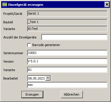 Felder die in EleLa nicht genutzt sind werden nicht in den 2D Code aufgenommen. Die Info Zeile kann in der "Konfiguration/Global" mit einem Defaultwert vorbelegt werden. Doppelklick auf das Eingabefeld übernimmt den Wert in das Feld und kann anschließend geändert werden. Position KopierenBeim Kopieren eines Einzelgeräte Datensatzes werden die Felder SNr, GNr, Barcode, Adresse, Prüfer, Lieferung und Service gelöscht sowie der Status auf "Lager" gesetzt. Einzelgeräte erzeugen aus Bauteile / Projekte / Geräte Im Import-/Export Menü bei Bauteile / Projekte / Geräte kann der Menüpunkt "Einzelgeräte erzeugen" angewählt werden. Dabei werden die hinterlegte Daten vom Projekt und Bauteil / Variante bereits übernommen und dieser Dialog gezeigt. Mit der "Anzahl der Einzelgeräte" wird die Anzahl wie viele Einzelgeräte automatisch erzeugt werden sollen festgelegt. Die Eingabe ist auf 2 Ziffern begrenzt, somit können maximal 99 Einzelgeräte-Einträge auf einmal erzeugt werden. Wenn man mehr Einzelgeräte benötigt so muss man die Funktion mehrfach ausführen. Mit "Barcode generieren" wird je Einzelgerät automatisch ein Barcode erzeugt. Dieser kann später manuell erzeugt werden. Seriennummer ist die Nummer des ersten zu erzeugenden Gerätes und wird bei jedem um eines erhöht. Als Seriennummer können nur Zahlenwerte eingegeben werden. Version / Variante / Bearbeitet werden in jeden Datensatz übernommen. Der Bearbeiter wird anhand dem angemeldeten Benutzername vom Betriebssystem automatisch voreingestellt. Mit "Erzeugen" werden dann die Datensätze der Einzelgeräte in der Tabelle erzeugt. Nachdem die Einzelgeräte erzeugt wurden können die weiteren Einträge in der Tabelle vervollständigt werden. Einzelgeräte zeigen aus Bauteile / Projekte / Geräte Im Import-/Export bei Bauteile / Projekte / Geräte kann der Menüpunkt "Einzelgeräte zeigen" gewählt werden, dann wird in die Projektansicht zum Einzelgerät gewechselt und der Filter direkt auf das Bauteil / Projekt / Gerät gesetzt. Dieser Menüpunkt ist ausgegraut wenn es zum Bauteil / Projekt / Gerät kein Einzelgerät gibt.