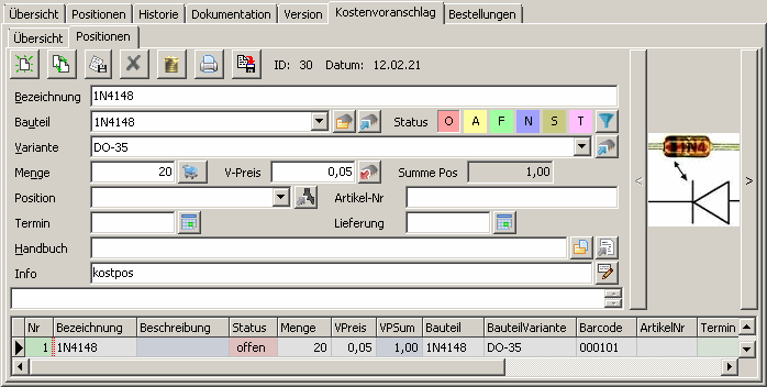 Projekte Kostenvoranschlag PositionenHier werden alle Positionen eines Kostenvoranschlages eingegeben. Es können nur Positionen eingegeben werden wenn ein Kostenvoranschlag angelegt wurde. Die Positionen können mit einem Bauteil und Gehäuse/Variante verbunden werden wobei automatisch der V-Preis aktualisiert wird. Jede Position kann mit einer Position aus den Projektpositionen verbunden werden um einen Verweis zum Projekt her zu stellen. Der V-Preis wird aus dem Bauteil Gehäuse/Variante verwendet, sobald ein Bauteil zugewiesen wird. Status: