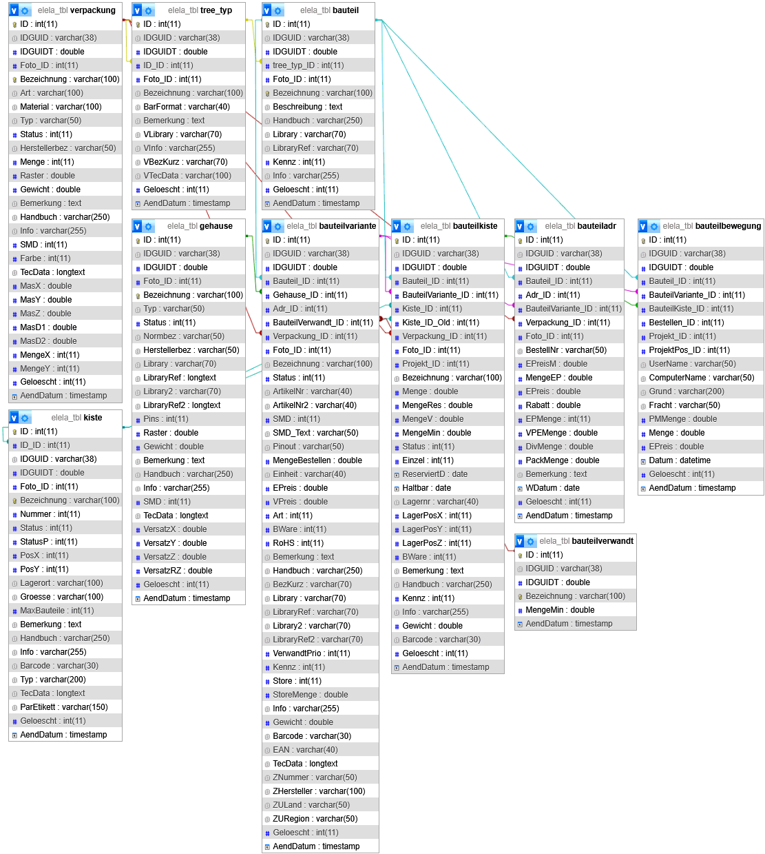 Aufbau Datenbankstruktur V4.3.25200Dieses Tutorial zeigt wie die Datenbankstruktur von EleLa aus sieht. Hier die Ansicht, nur Tabellen Bauteile und deren zugehörige Tabellen: