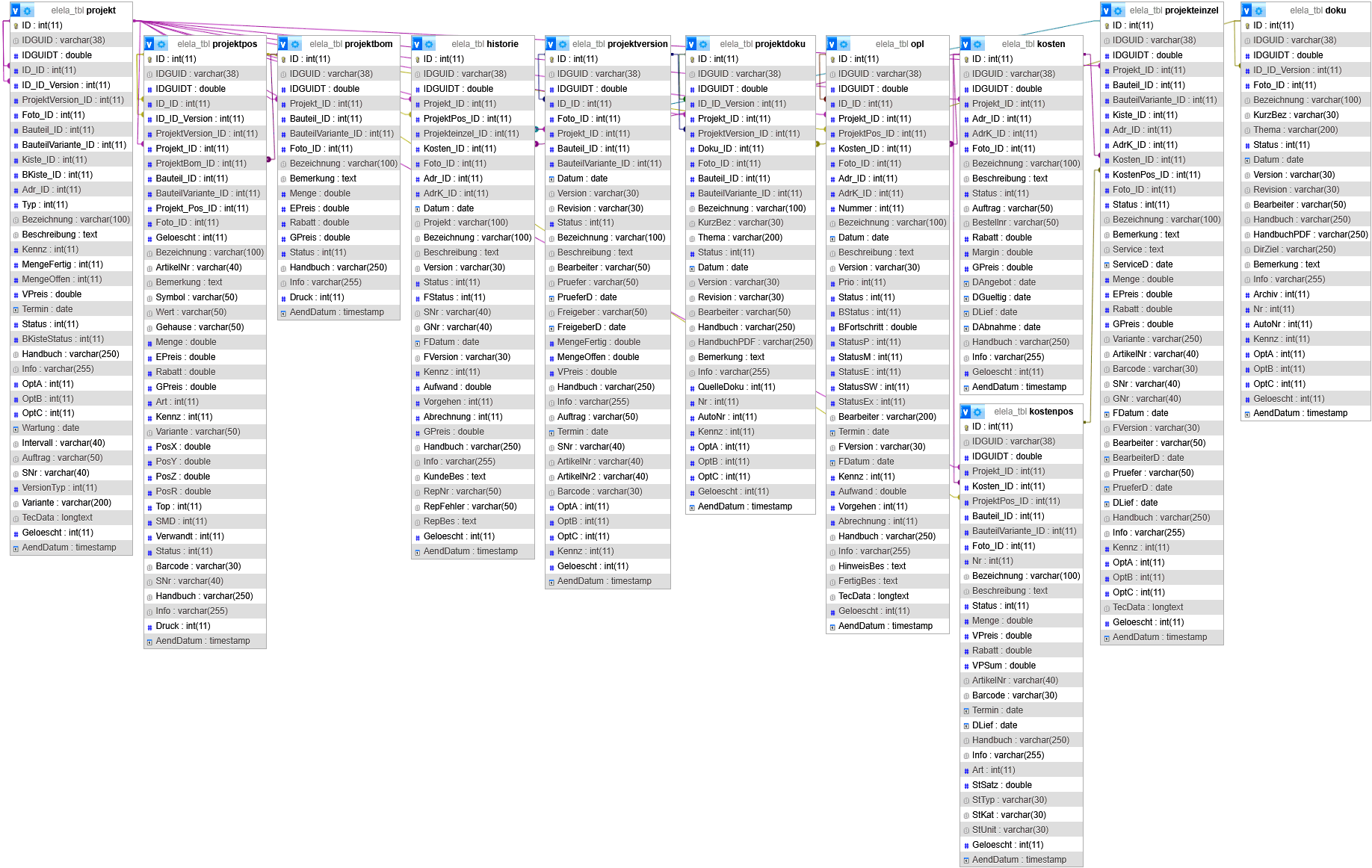 dann nur 0 oder 1 enthalten. Das Feld "TecData" ist ein Feld vom Typ JSON. Hier können diverse technische Daten mit eigenen Bezeichnern abgelegt werden. Das Format muss JSON sein, da die Datenbank direkt den Inhalt der JSON Daten weiter verwenden kann, z.B. darin suchen. Die Tabelle "param" dient nur für interne Parameter, die Tabelle "translate" nur für Übersetzungen, daher sind auch keine Verweise auf andere Tabellen nötig. Die Tabelle "recht" beinnhaltet die Zugriffsrechte der einzelnen Benutzer. Die Tabelle "foto" beinhaltet alle Bilder. Jede Tabelle, der man ein Bild anhängen kann hat somit eine Spalte "Foto_ID" um auf die Bild-Daten zu verweisen. Das Feld "AendDatum" wird immer bei Änderung mit dem aktuellen Zeitstempel beschrieben. Somit kann man jederzeit nachvollziehen wann zu letzt ein Datensatz entweder durch einen Benutzer oder durch EleLa geändert wurde. BauteilVariante Tabelle:Die Felder ArtikelNr, Barcode, Art, die auch in den Projektpositionen und Kostenvoranschlag Positionen vorhanden sind, kopiert EleLa automatisch bei Auswahl eines Bauteils mit in die verknüpfte Felder und überschreibt so evt. vorhandene Einträge. Jedoch kann man nachträglich diese Werte jederzeit ändern. Projekt und ProjektPos Tabelle:Diese Tabellen unterstützen eine Versionierung von Projekten. Die Versionierung ist in den Spalten gelöst: