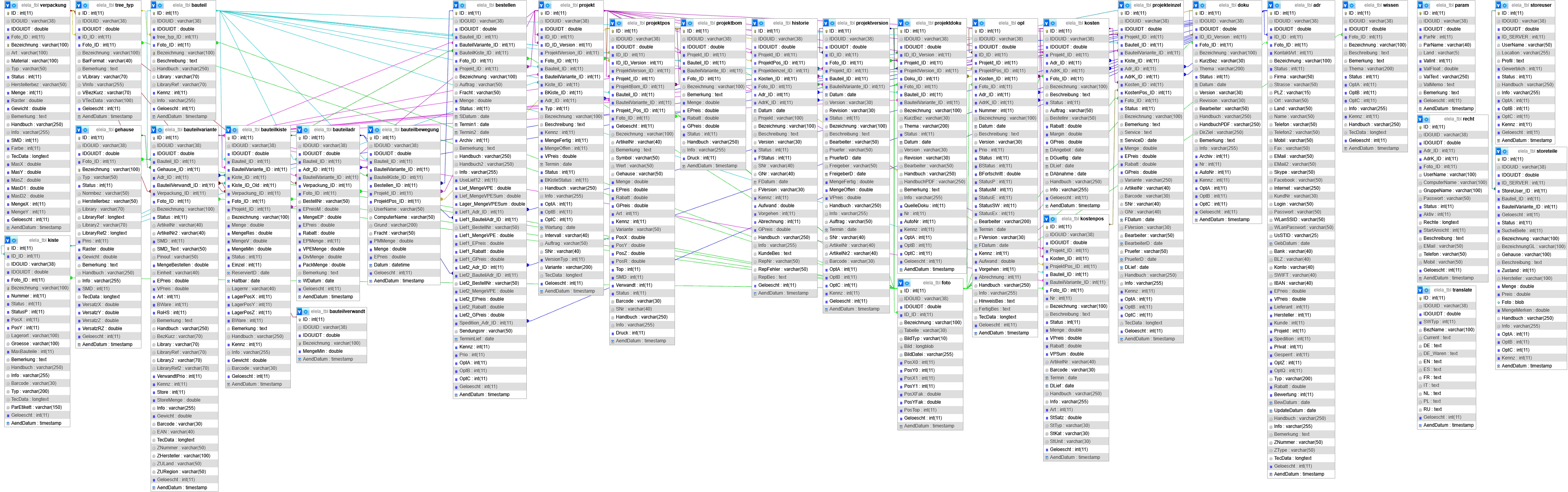 Hier die Ansicht, nur Tabellen Projekt und deren zugehörige Tabellen:Ansicht Projekt und die verknüpften Tabellen, ohne Bauteil und Doku. Hier alle Tabellen, die gesamte Datenbank: