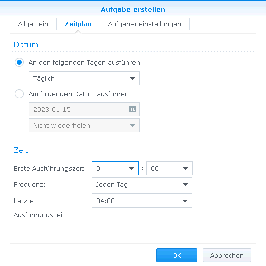 Hier kann die Original Script Datei geladen werden. Einrichten "Aufgabeplaner" in der SystemsteuerungDie Systemsteuerung wird über das Web-Interface von der Discstation geöffnet. Der "Aufgabenplaner" legt automatisch je Eintrag einen Cron-Job in der Datei "/etc/crontab" an. Die DS muss dafür nicht neu gestartet werden.
