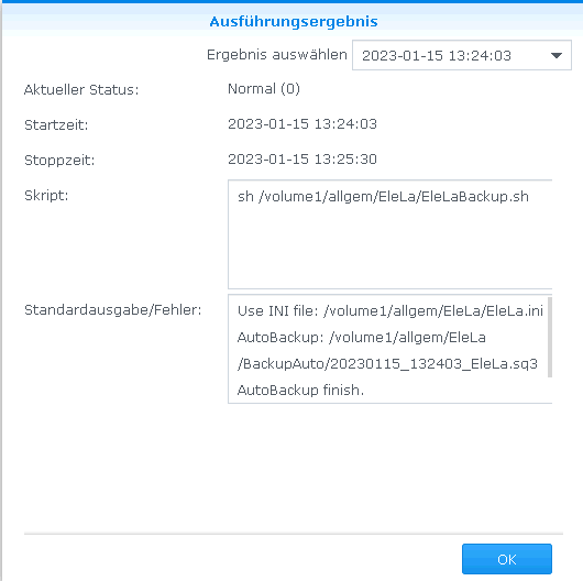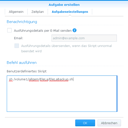 Dateien: Diese Freigaben sind Beispiele und können entsprechend eurer Discstation (DS) angepasst werden. Der Script "EleLaBackup.sh":Der Script sichert alle Datenbank von EleLa. Wichtig: Es muss immer der volle Pfad ausgeschrieben werden, relative Pfade kennt der Aufgabenplaner nicht (Cron-Job)! Auch muss der Benutzer im Aufgabenplaner die entsprechende Rechte für den Dateizugriff und MariaDB haben. Diese Scrip Datei liegt im gleichen Ordner wie EleLa.EXE. Zusätzlich wird die Datei "EleLaBackup.64" mit in das EleLa Verzeichnis kopiert. (In diesem Besipiel hat die DS die CPU-Architektur x86-64, bei anderen CPU Architekturen benötigt man eine andere Version von EleLaBackup, bzw. es funktioniert dann nicht.)